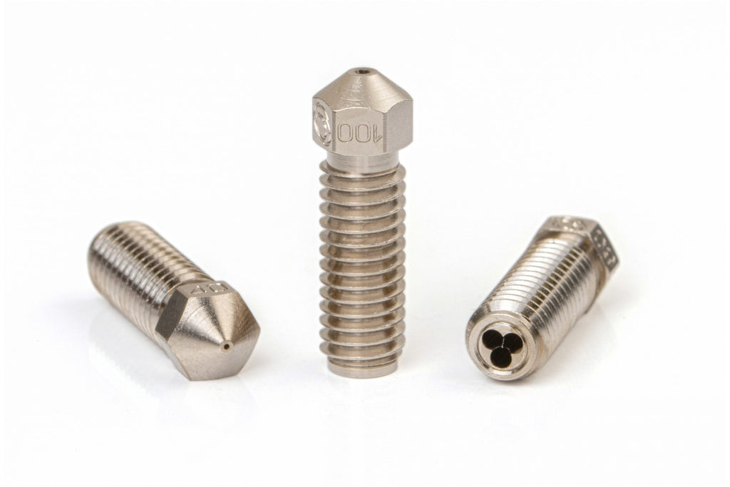 These are nozzles for high flow applications Increase the Max Volumetric Flow of your Volcano heat block by 50% They are manufactured by Bondtech in-house,and will fit the following blocks/printers: E3D Volcano blocks Other Volcano type blocks Artillery Sidewinder X1 and X2 Anycubic Vyper FLSUN Super Racer Artillery Genius Pro Anycubic Kobra a...