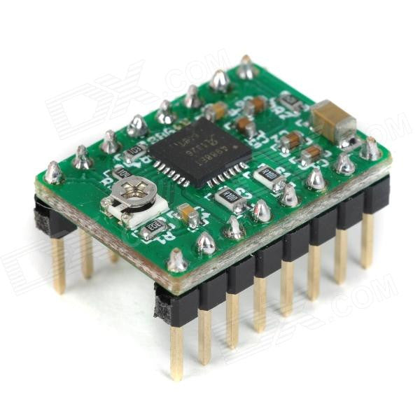 3D Printer Stepper A4988 Driver for 3D Printer controllers Dimensions: 0.83 in x 0.63 in x 0.47 in (2.1 cm x 1.6 cm x 1.2 cm) Weight: 0.18 oz (5 g) Color: Green + black Material: PCB + plastic Specification: PCB copper clad process upgrade to 2oz; SMT manufacturing Features Voltage: 1.25V; Current: 1.56A
